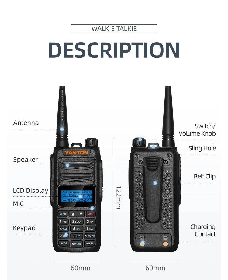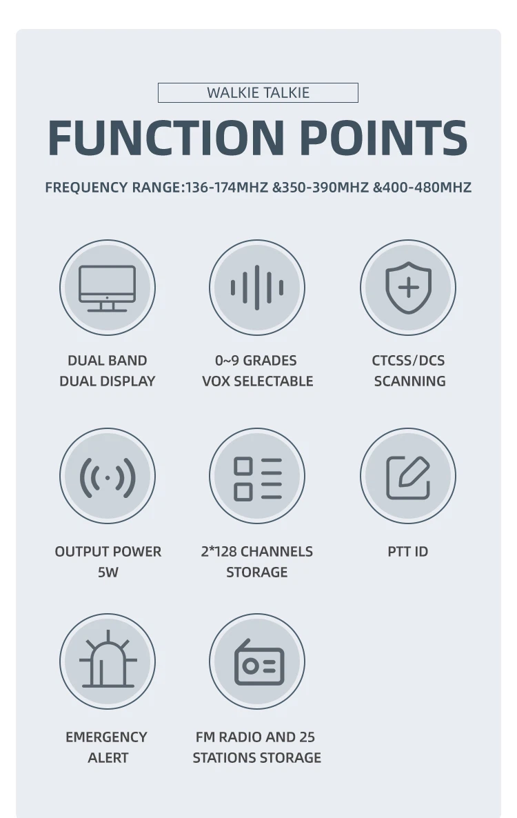 T-UV3D je 5W radio. Frekvencijski raspon je 136-174mhz &350-390MHZ &400-480mhz, Dvopojasni,, Hitno upozorenje, FM radio i pohrana 25 postaja, Postavka razlike frekvencije, PC softverski programibilan, funkcija žičanog kloniranja, obrnuta frekvencija, široki/uski pojas (25 kHz/12,5 kHz), zaključavanje zauzetog kanala (BCLO), mjerač vremena isteka odašiljača (TOT), eliminacija završnog tona, LED postavka, postavka zvučnog signala, Prijenos putem bipera, dvostrukog monitora, primanja uštede energije, itd.
